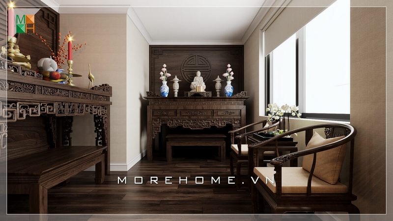 Morehome gợi ý mẫu trang trí nội thất phòng thờ hiện đại bằng gỗ tự nhiên cao cấp cho gia chủ tại các căn hộ chung cư cao cấp, nhà biệt thự, nhà phố.