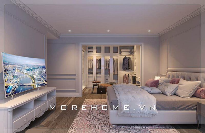Bố trí nội thất phòng ngủ tân cổ điển có tủ quần áo khoa học, phong thủy.