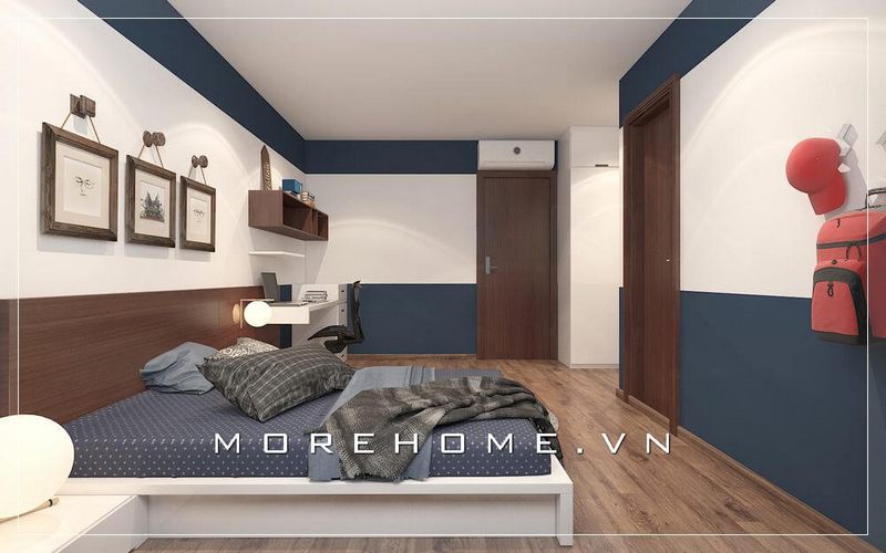 Nội thất phòng ngủ gỗ công nghiệp hiện đại, kết hợp với màu sắc xanh- trắng tạo nét trẻ trung, tươi mới mang đến cảm giác thích thú và sinh động hơn tại phòng ngủ bé trai